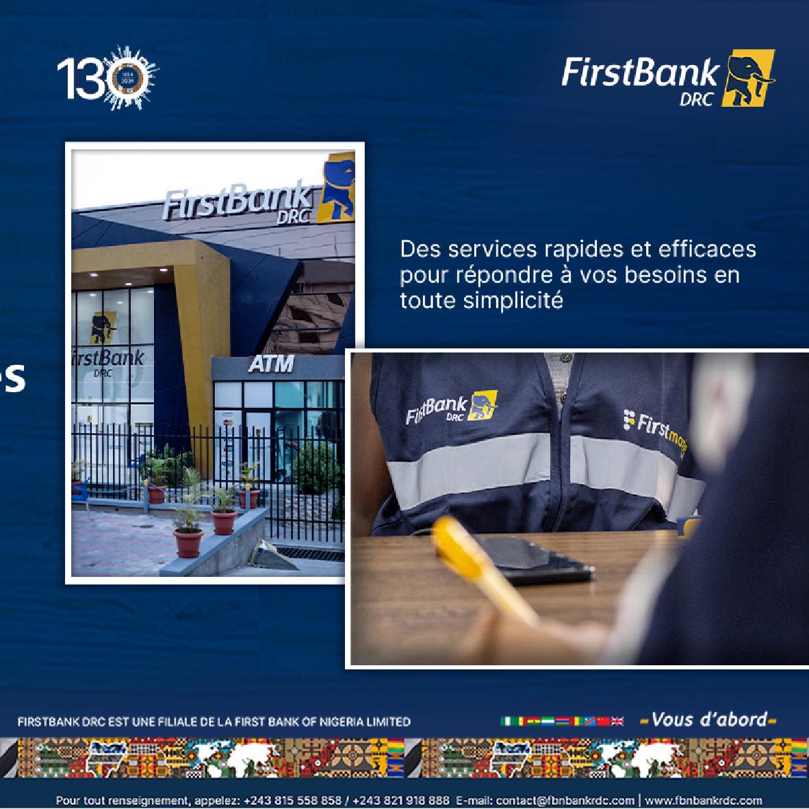 First Bank DRC SA (First Bank) est l’une des banques les plus prestigieuses de la République Démocratique du Congo, qui contribue au développement économique du pays depuis 1994. Malgré les nombreuses transformations qu’elle a subies au fil des années en raison des défis économiques, politiques et réglementaires de la RDC, elle est restée résiliente, digne de confiance et dynamique.